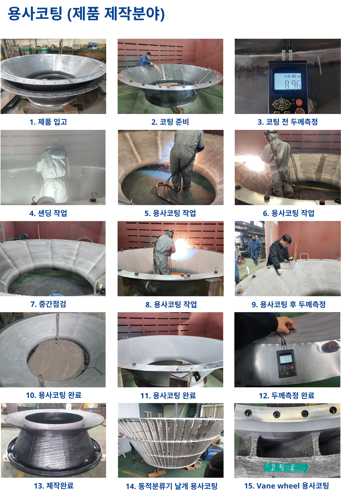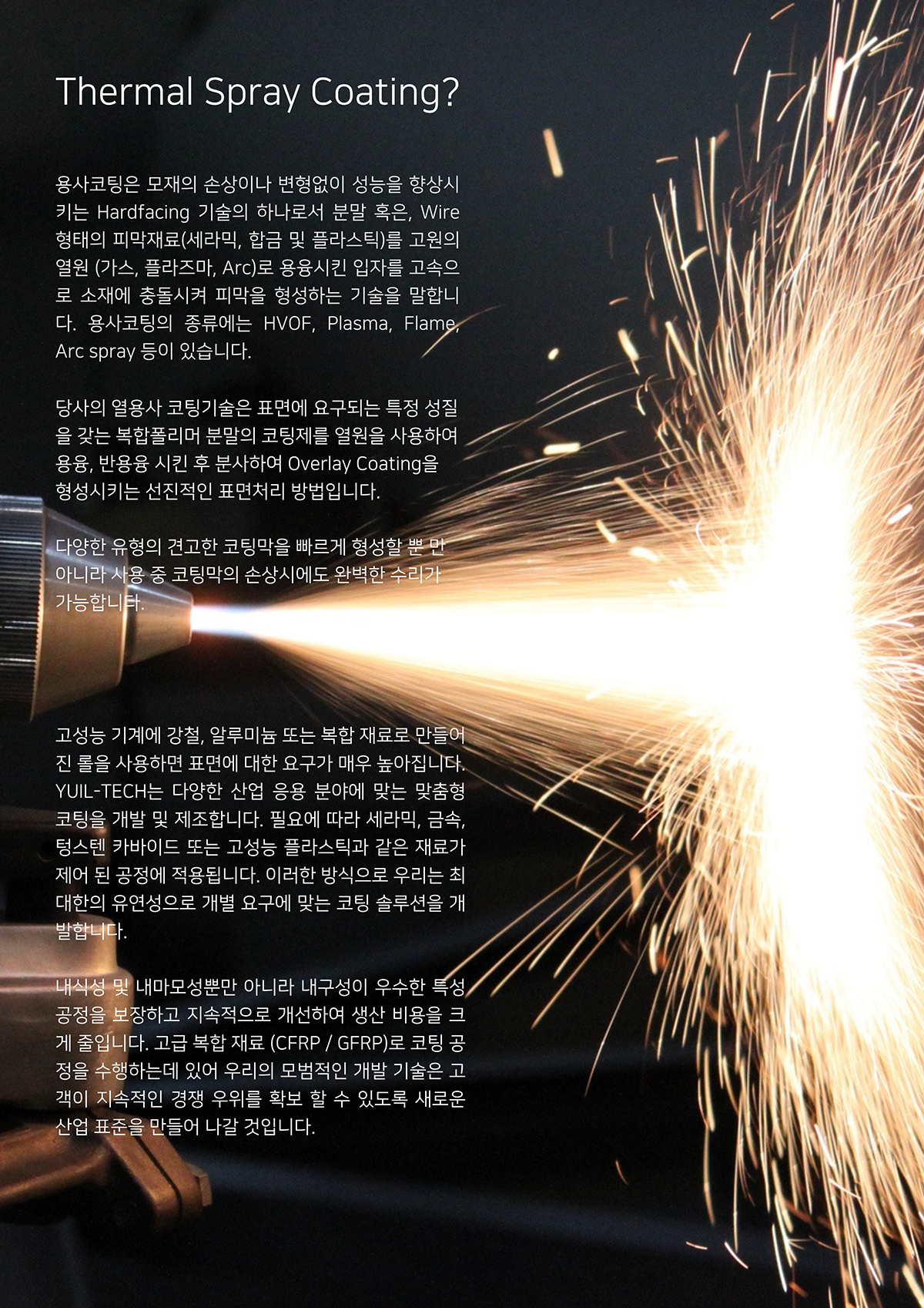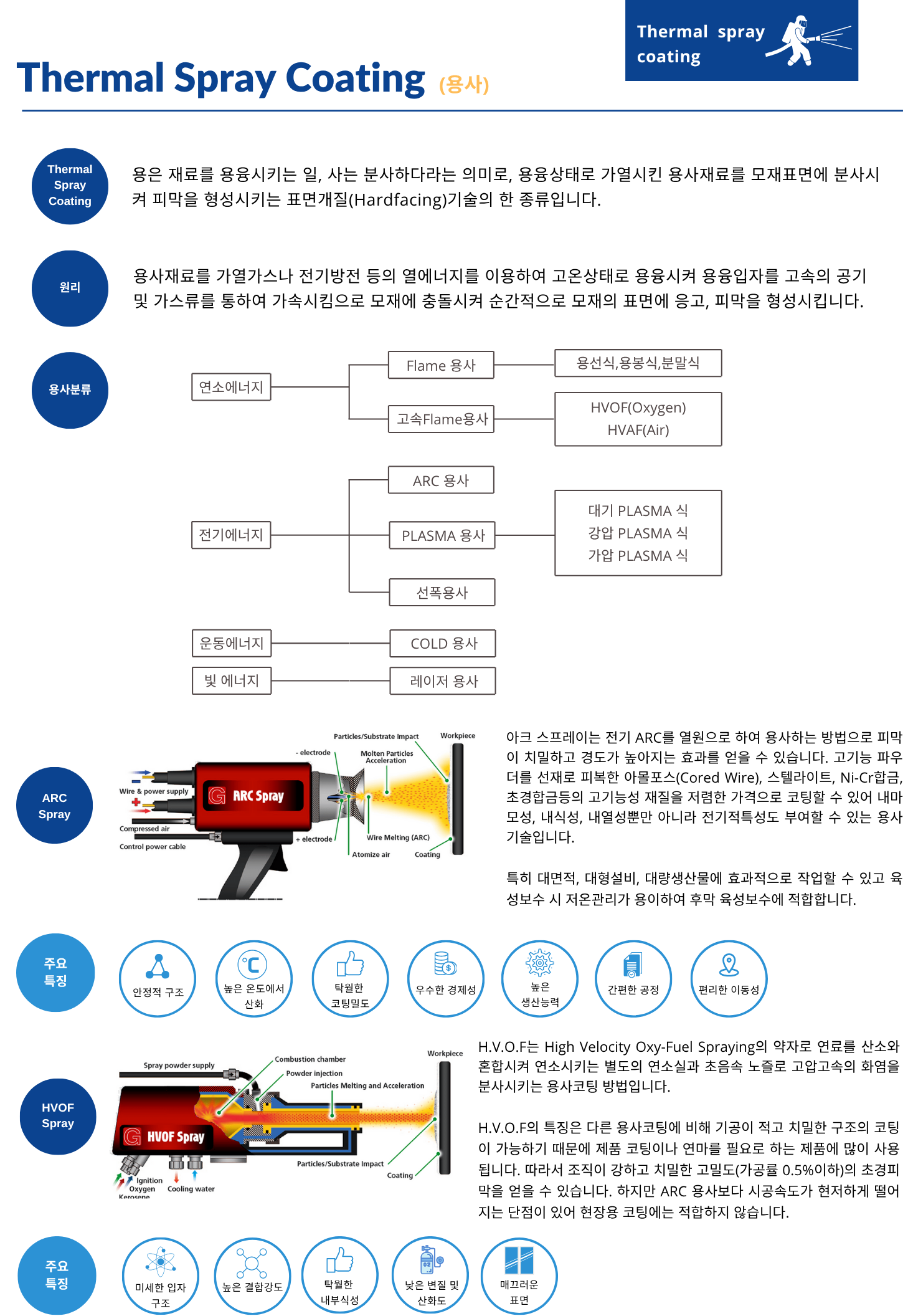 유일테크는 HVOF(초고속용사), ARC 스프레이, 플레임 스프레이 등 다양한 용사공정을 적용하여, 보일러 튜브 표면에 내열·내산·내마모 특성이 강화된 금속층을 형성합니다.
