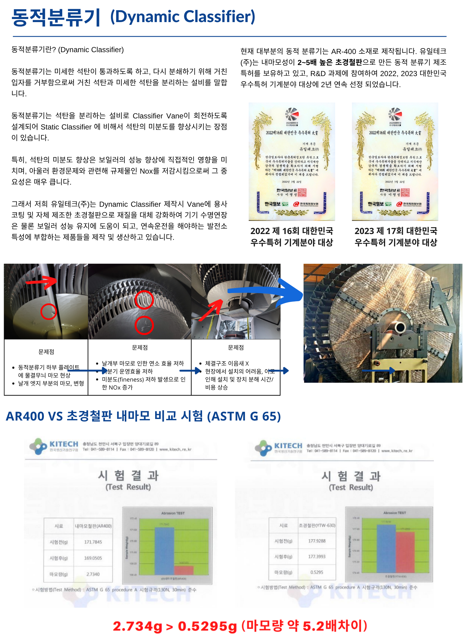 Yuil Tech has developed a high-performance model by applying hardfacing steel and thermal spray coating technologies with 2 to 3 times higher wear resistance than AR400, improving both product lifespan and boiler performance.