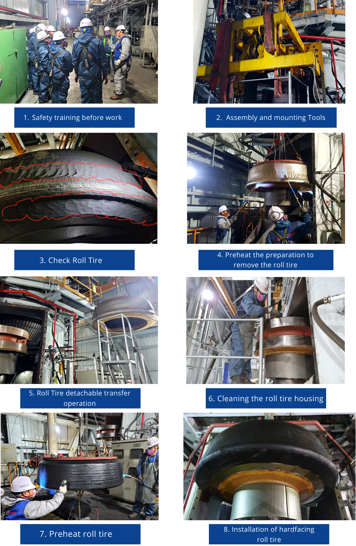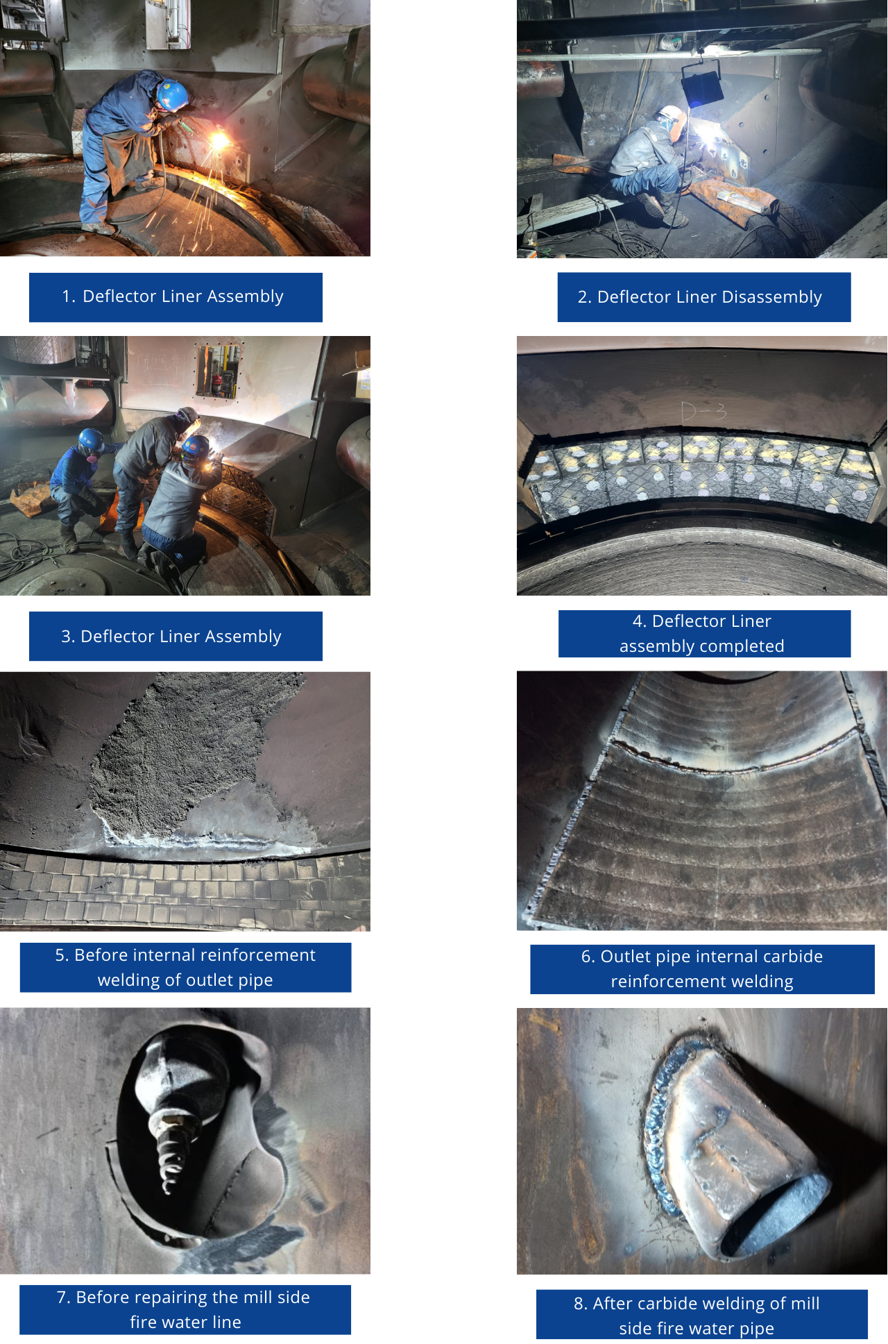 Major wear components such as Roll Tire, Table Liner, Grinding Bowl, Classifier, and Inner Vane are disassembled and serviced on-site, applying hardfacing and coating technologies to significantly extend their service life.