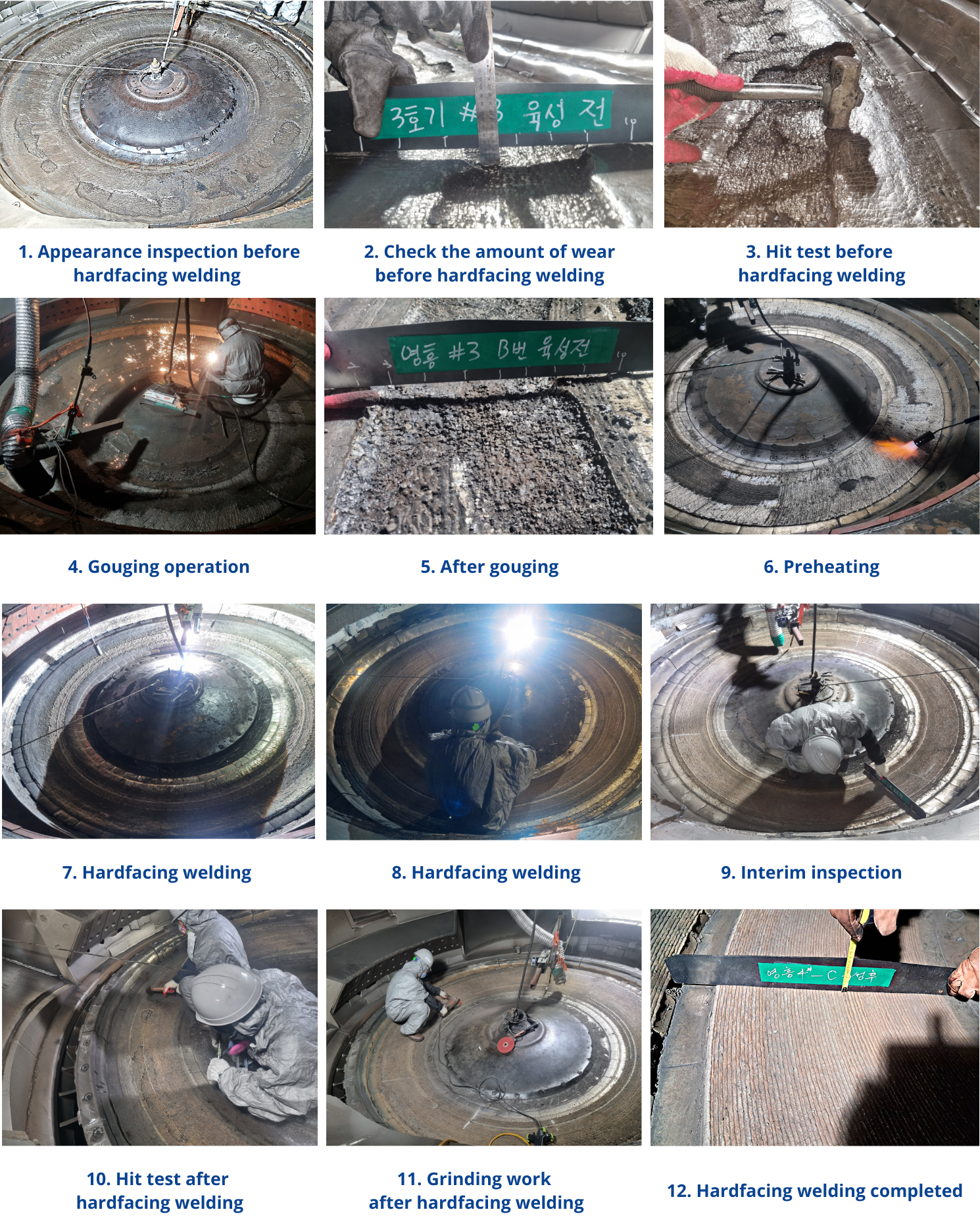 Yuil Tech performs advanced buildup welding works for key wear components such as Grinding Roll Tire and Grinding Bowl in pulverizer systems of power plants.