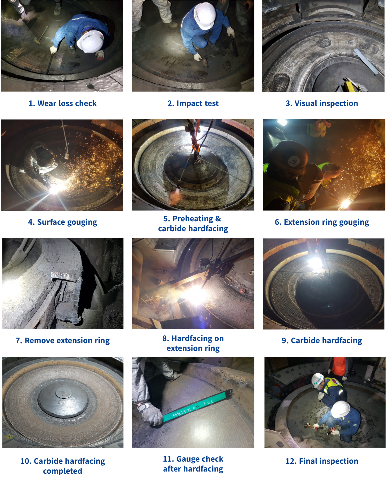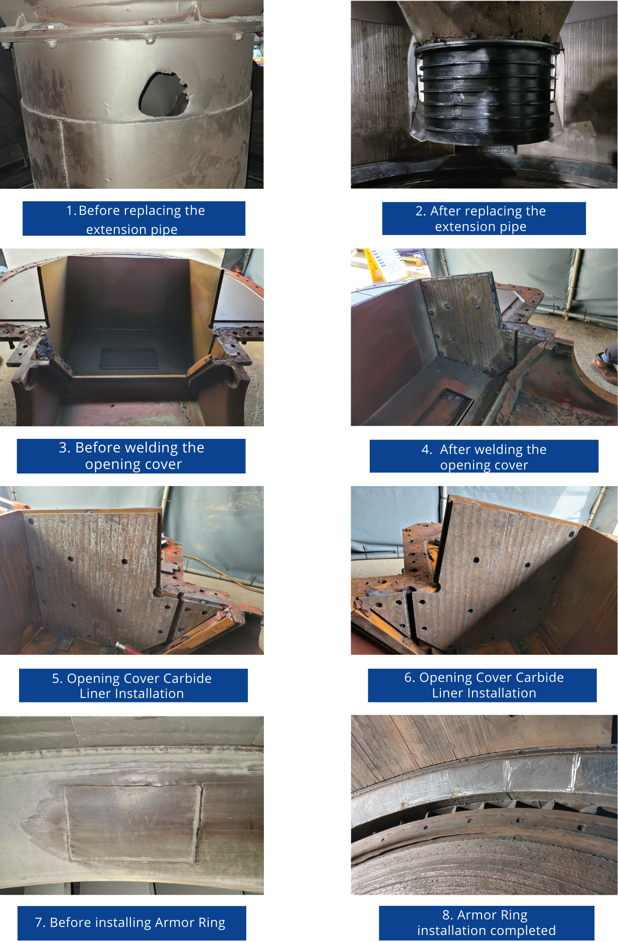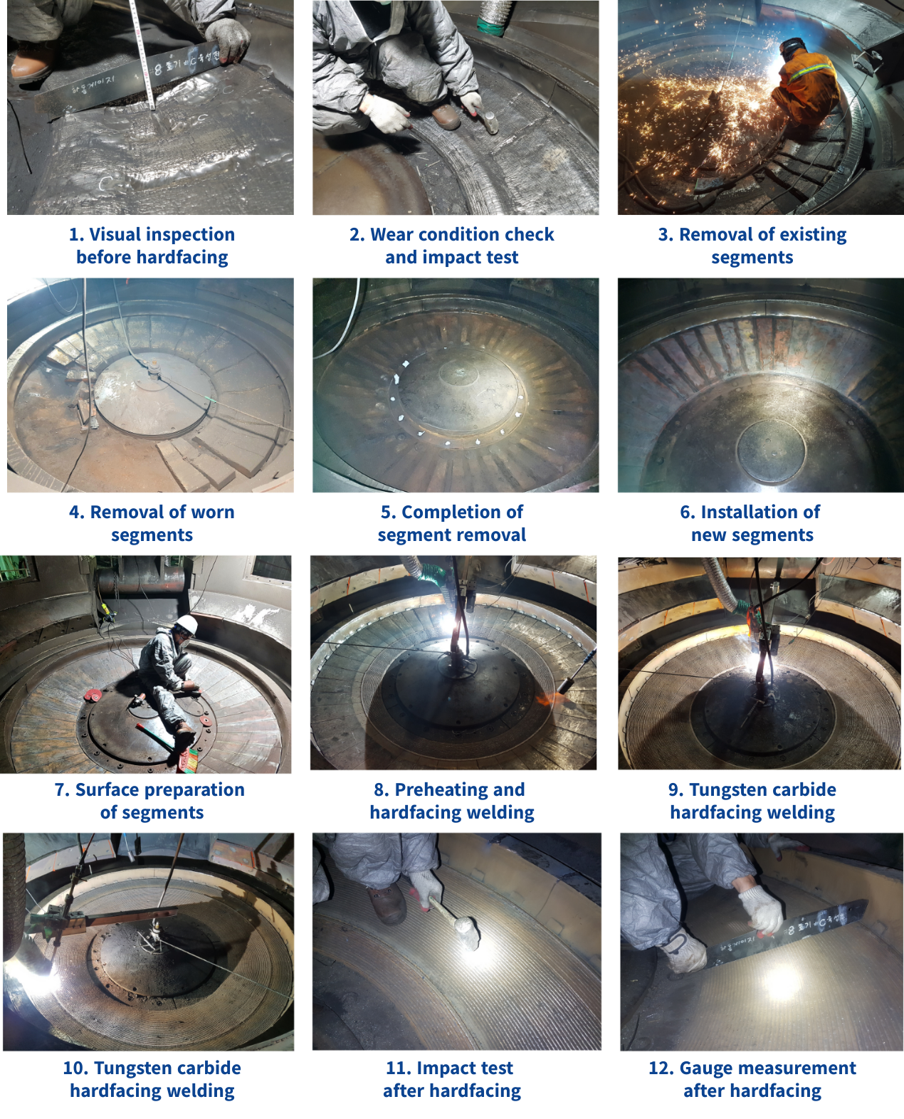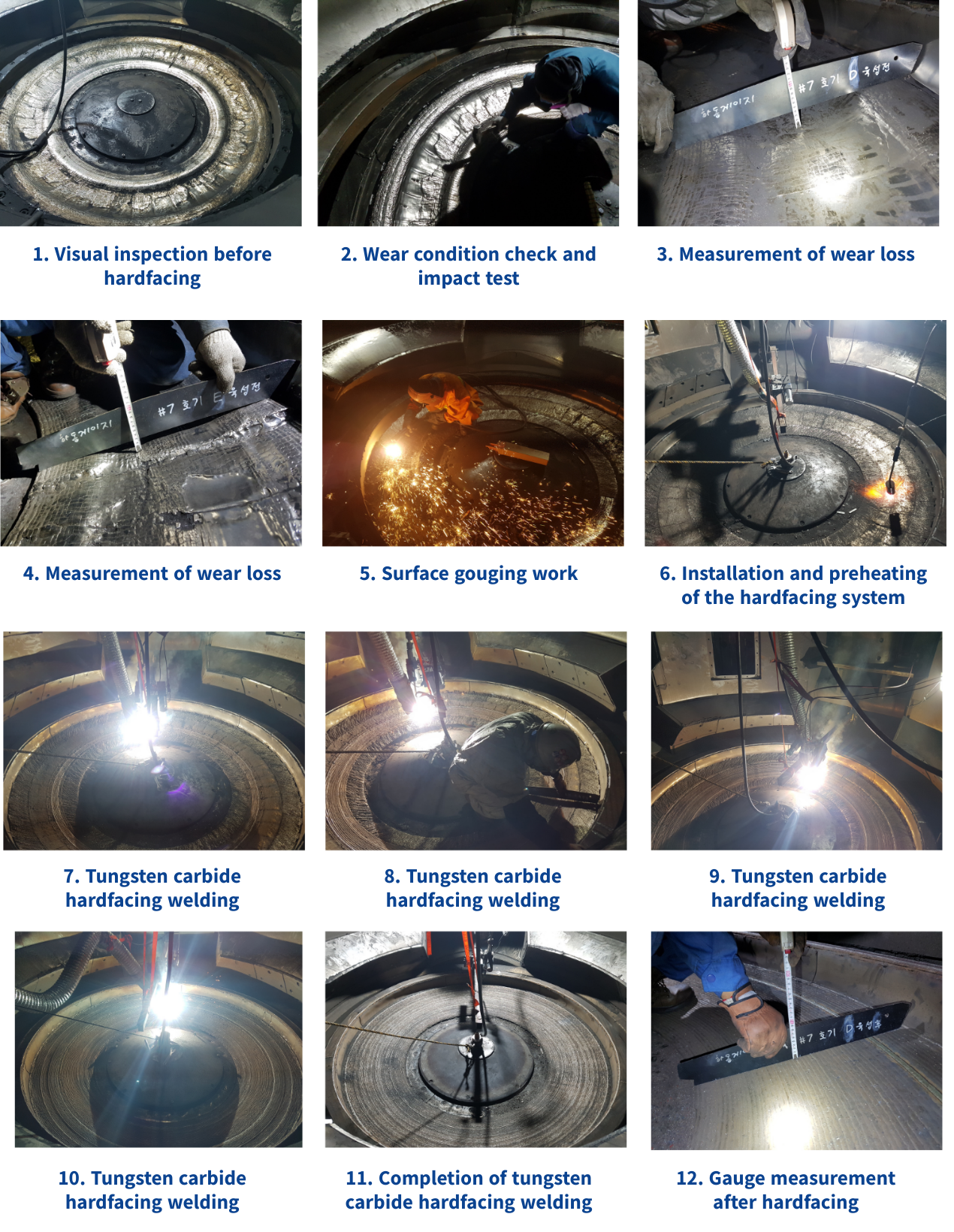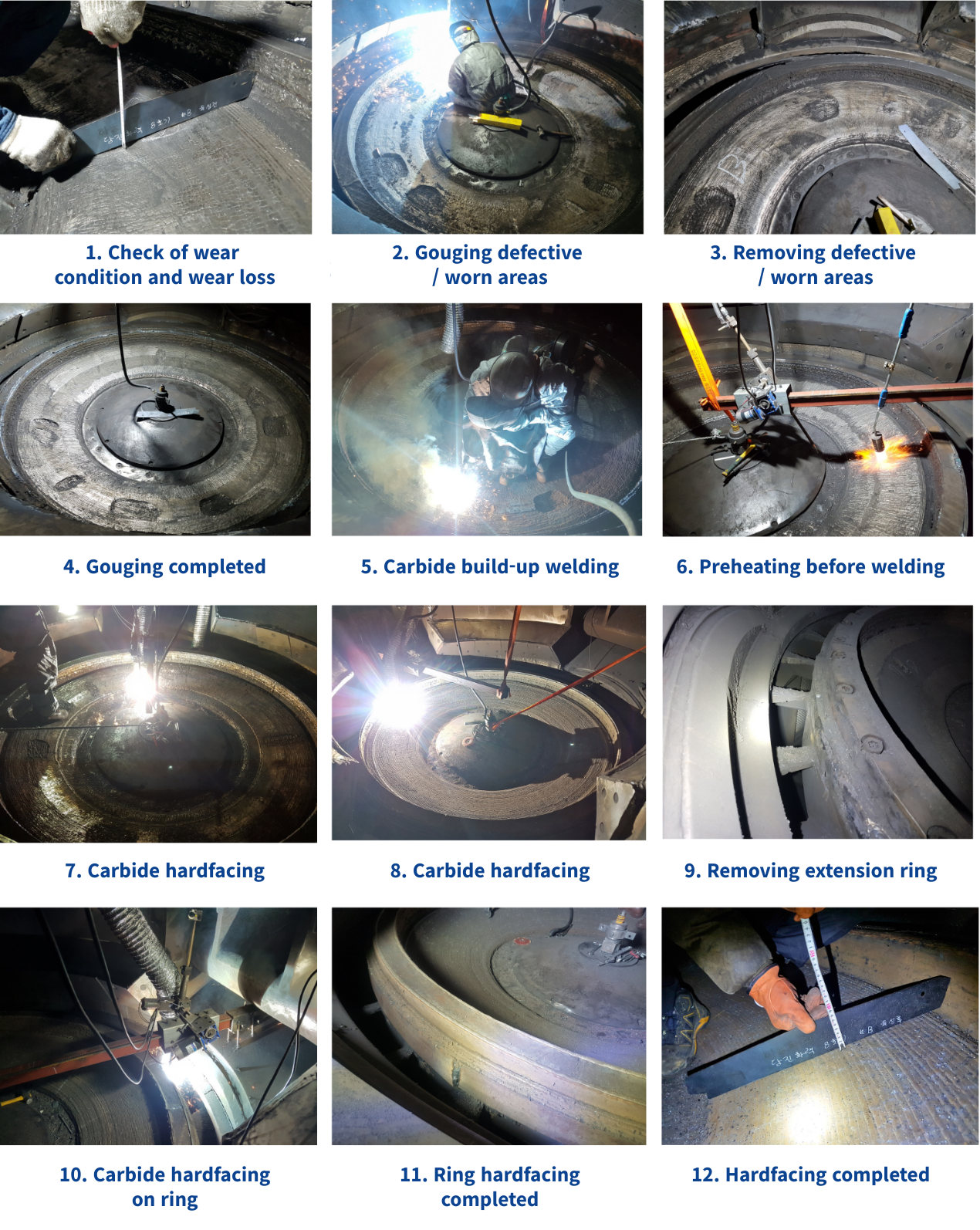 Yuil Tech performs advanced buildup welding works for key wear components such as Grinding Roll Tire and Grinding Bowl in pulverizer systems of power plants.
